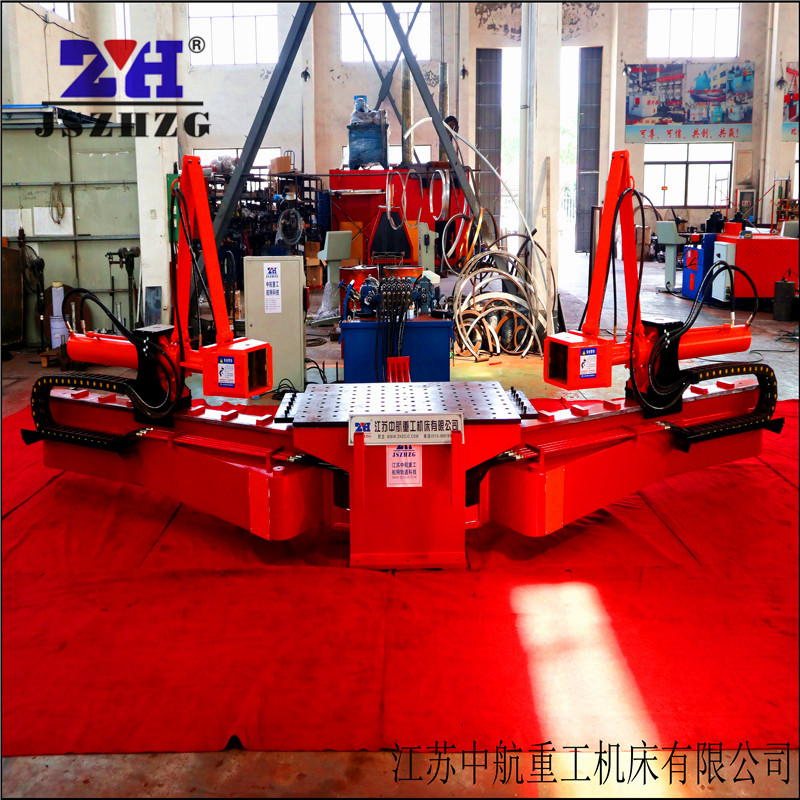 拉彎機(jī)結(jié)構(gòu)革新特指一種拉彎機(jī)結(jié)構(gòu)改良。包括有機(jī)架、轉(zhuǎn)臂,機(jī)架上側(cè)結(jié)合有一大盤,而機(jī)架前端兩側(cè)對稱樞接兩轉(zhuǎn)臂,轉(zhuǎn)臂上軌面安裝有附帶夾頭的活缸座,驅(qū)動轉(zhuǎn)臂的拉彎油缸的一端鉸接于機(jī)架靠前段,另一端由活塞桿之外端鉸接于轉(zhuǎn)臂的內(nèi)側(cè)凸緣上,該凸緣位于轉(zhuǎn)臂的靠外段上,所述機(jī)架、轉(zhuǎn)臂及拉彎油缸之間為活動三角關(guān)系。拉彎油缸無須穿過轉(zhuǎn)臂內(nèi)中部,由此轉(zhuǎn)臂也就無須在內(nèi)中部鏤空,確保轉(zhuǎn)臂的一體性,加強了轉(zhuǎn)臂的強度和剛性